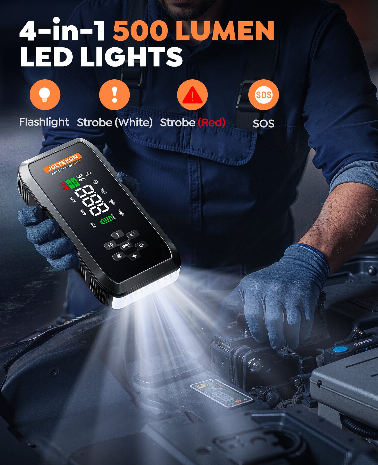 - ➤【REAL-TIME DISPLAY & 4-IN-1 LED LIGHT】Whether it's snowing or sunny, the car jump starter's large, clear 3.3-inch LCD screen clearly displays remaining battery life and operating status. The built-in 500LM LED light offers 4 modes (steady on, flashing white, flashing red for enhanced visibility in emergencies, and SOS), making it ideal for nighttime illumination, roadside repairs, or emergencies.
