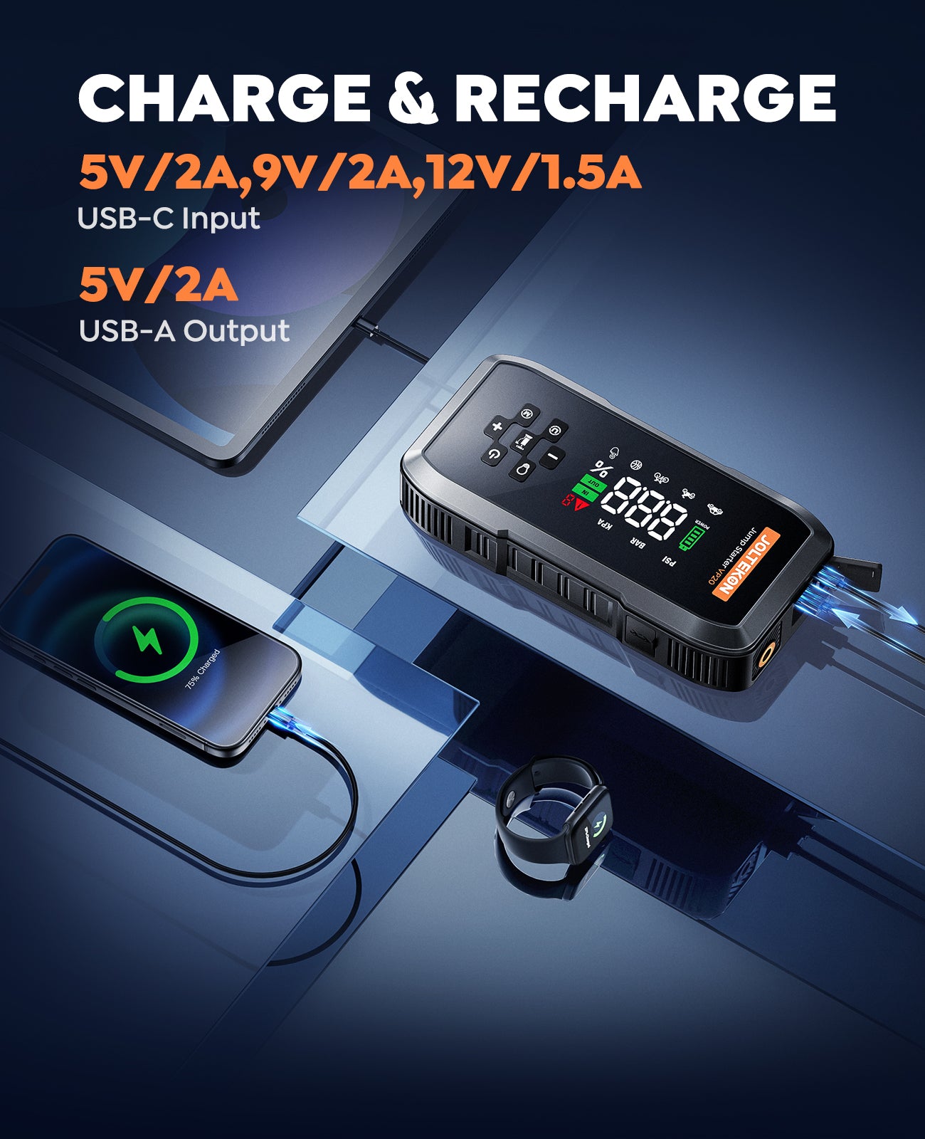 - ➤【EMERGENCY OUTDOOR ESSENTIALS】If your phone runs out of battery while outdoors, don't worry! Our car battery jump box lets you charge any device anywhere, anytime. It offers up to 24 months of battery life and over 1,000 charge cycles. Give you the most reassuring experience.