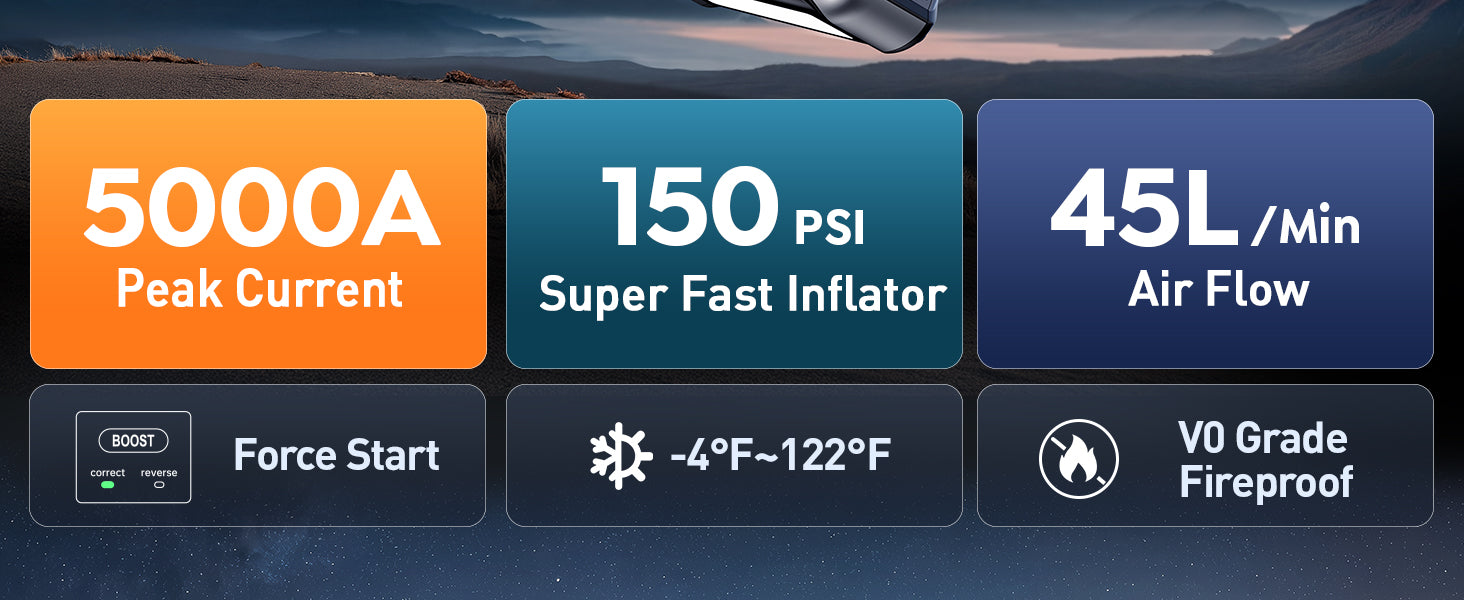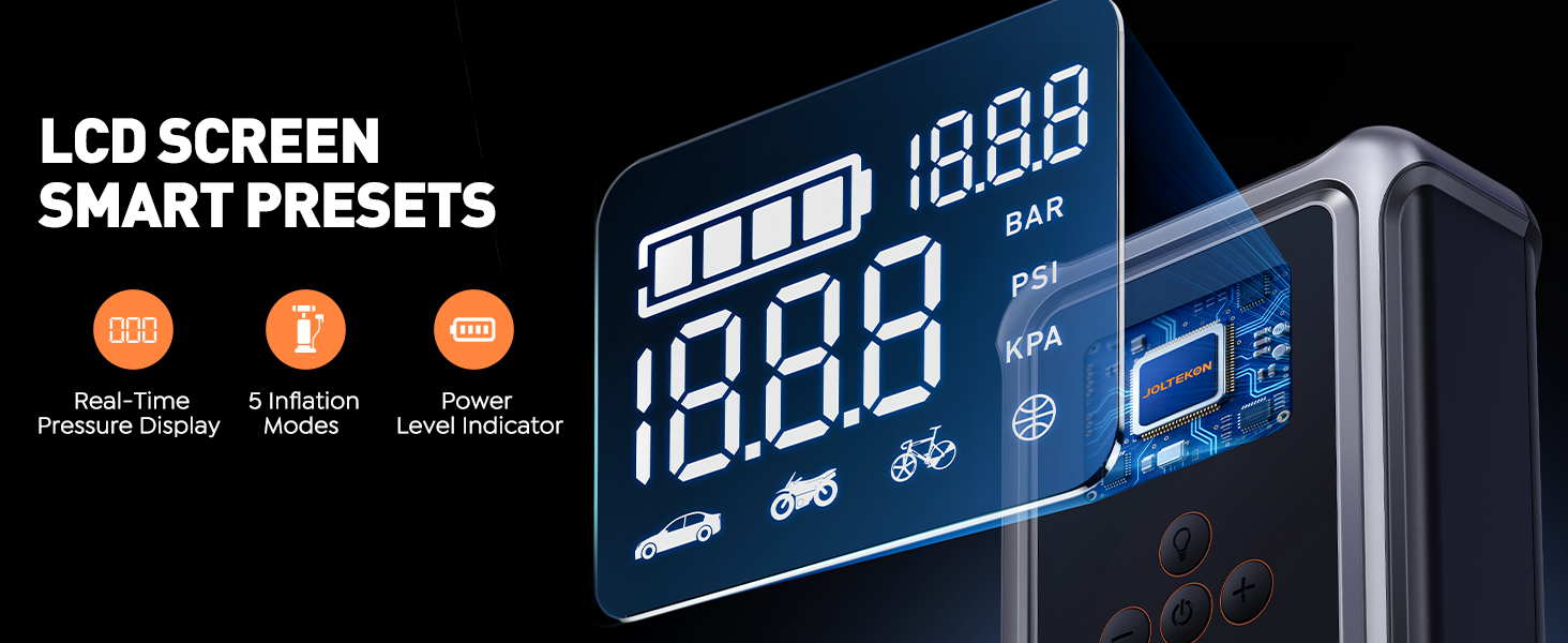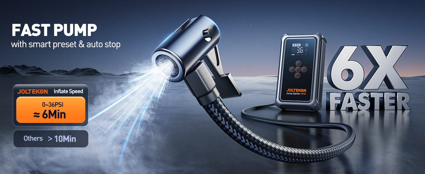 【Multi-functional Jump Starter, Inflate Effortless 】With smart preset, pressure detection and auto shut-off, this all-in-one jump starter power pack expertly inflates everything from cars to balls at a rapid 45L/min. As a versatile car jump starter power bank, the Joltkon car battery booster jump starter allows switching between 5 using modes and 3 pressure units on the LCD display, plus includes 5 nozzles for any task,and it features a 50cm detachable patented hose for superior reach and flexibility effortless. This professional 150 PSI car jump starter makes inflation effortless while serving as a dependable battery jump starter for all your needs.